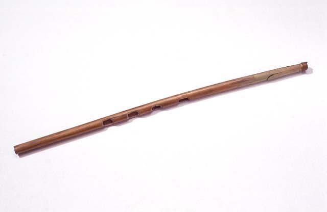 Ruokopilli, jossa soittimen lehdykkä on viilletty kasvivarteen. Sormiaukkoja on neljä.