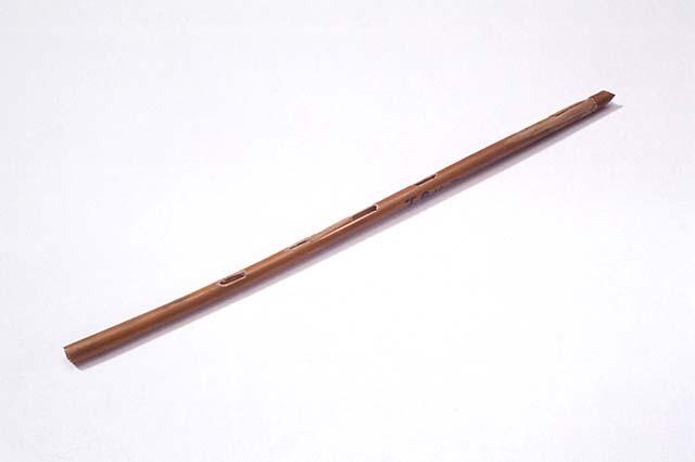 Ruokopilli, jossa soittimen lehdykkä on viilletty kasvivarteen. Sormiaukkoja on neljä.