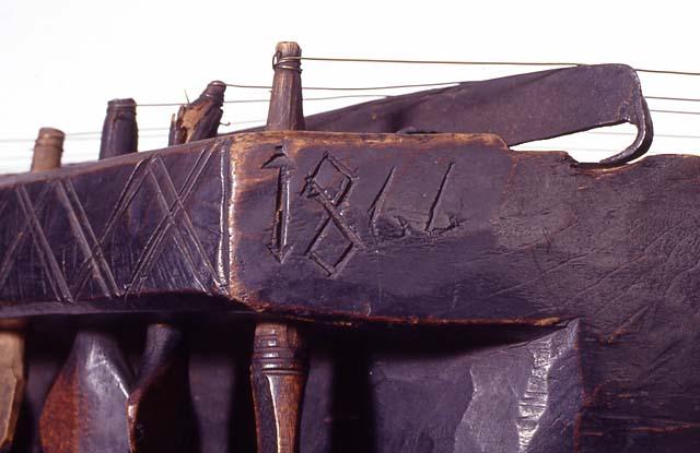 12-kielinen kantele. Yksipuinen koppa on päältäpäin koverrettu ontoksi. Kansilauta kiinnitetty rautanauloin. Kannessa kaksi pyöreää ääniaukkoa, halkaisijoiltaan 2,1 ja 2,9 cm. Kansilaudan toisesta reunasta on lohjennut pala pois. Metallikieliä on jäljellä 10. Ne on toisesta päästään kiinnitetty rautavartaaseen ja toisesta puisten viritystappien halkaistuihin päihin. Kaikki tapit ovat jäljellä, mutta näistä kaksi on uudempia. Viritystappien edessä on 1,6 cm korkea rautalista tallana. Ponnen toisesta sivusta on lohjennut pala pois ja vartaan pää on jouduttu kiinnittämään rautalangalla ponteen lyötyyn ruuviin. Kanteleen pohjan pitkältä sivulta on samoin lohjennut pala pois. Lavan sivu on koristettu ristikkokaiverruksin ja kanteleen sivuun on kaiverrettu vuosiluku 1866. Kanteleen kärkeen on tehty reikä. Soitin on tummunut mustaksi.