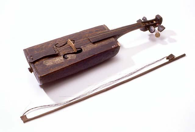 Kotitekoinen viulu jousineen. Viulun koppa on tehty yhdestä puusta, päältäpäin kovertamalla. Pyöreäpohjaisessa kopassa on suorat sivut. Kansi on upotettu vahvuudeltaan koppaan. Kannessa f-aukot, pituudeltaan 8 cm. Kieltenpidin on sidottu päädyssä olevaan puunappulaan. Kielet ovat yhtä kuparikieltä lukuunottamatta suolikieliä. Kaulan kiinnitystä on vahvistettu naulaamalla sen alapuolelle tukikappale. Soittimen päähän, kaulan viereen on naulattu metallilista, ja kantta on paikattu liimapaperein. Talla ei ole alkuperäinen. Soitin on tummunut mustaksi. Jousi on kansanomainen, puu tummunut. Frossin kiinnitys on irronnut. Jouhet tummat.