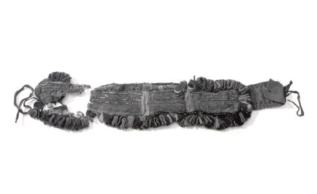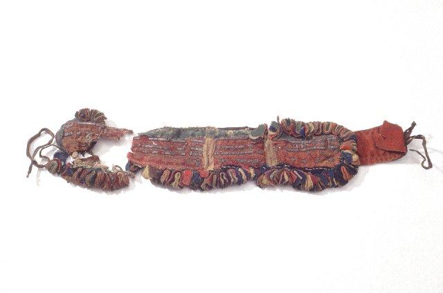 Esineen pohjana on ohut kulunut nahkakaitale. Päällipuoli on ommeltu punaisesta verasta (verka on tod. näk. värjätty valmiina kankaana ja vanutus sen jälkeen kulunut, jolloin väri on haalistunut) ja koristeena on lisäksi tummansinistä, vihreää ja keltaista verkaa. Punaisen veran päälle on ommeltu tinalankakirjontaa, joka on kulunut monin paikoin. Esineen reunoja kiertää lähes kauttaaltaan useasta päällekkäin asetetusta verkatilkusta muodostuvat tupsut, jotka on ommeltu tiheästi vierekkäin. Kiinnittämistä varten vyön toisessa päässä on n. 10 cm pitkä ja 6 cm leveä, nahkasta ja punaisesta verasta ommeltu kieleke, jonka päässä on nahkanyöri ja -raksi. Vyön toisesta päästä on irronnut huonokuntoinen palanen ja lisäksi vielä nahkanyöri, joka ilmeisesti on kiinnityksen vastakappale.