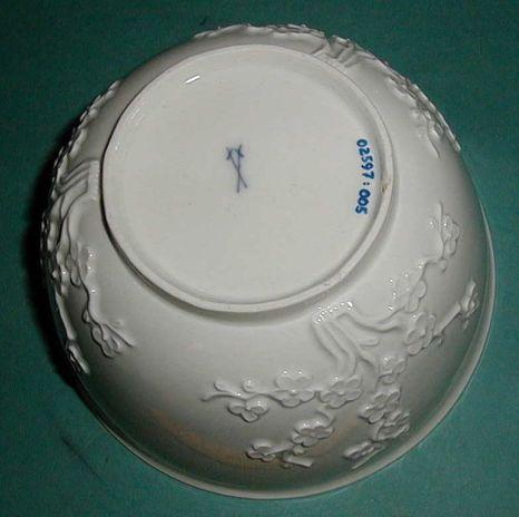 Loivasti profiloitu (suuaukko ylöspäin). Korkeuttaan leveämpi, rivaton. Suuaukko ja pohja pyöreät. Seinämässä kolme reliefikoristekenttää, joissa itämaisvaikutteinen kukka aihe (vrt. SMM2597:2-4). Ei nostosta aiheutuneita vaurioita. Kulho on Meissenin ns. Böttger-posliinia. Nimi tullut eurooppalaisen posliinin keksijän Johan Friedrich Böttgerin (k. 1717) ja hänen aikanaan valmistetun posliinin mukaan. Kulho Joachim Kändlerin ajan tuotantoa, ajoittuu vuosiin 1722/31-1747.