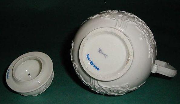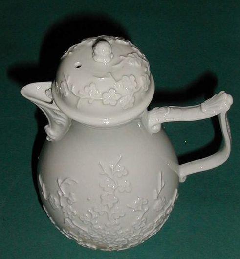 Profiloitu, kaatonokallinen ja rivallinen lasitettu posliinikannu. Kansi ei kuulu löytöön. Leveintä seinämää kiertää reliefikoristelu, jossa itämaisvaikutteinen kirsikkapuu-aihe. Kaatonokassa ja rivassa rokokooaiheita ( voluutti, kohoaalto). Nokan päällä, astian seinämässä laakerinlehtiaiheita. Nokan ja astian välinen aukko sydämen muotoinen. Kansi ei kuulu löytöön. Kannu on Böttger-posliinia.