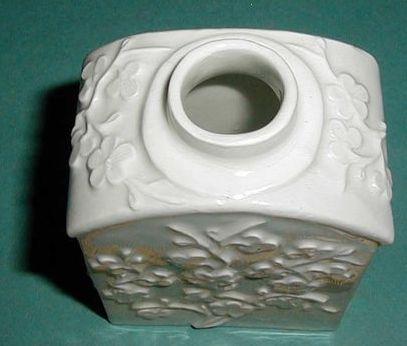 Meissenin posliinia oleva valkoinen teerasia. Suorakaiteen muotoinen rasia, jonka olat ovat kaarevat. Yläsivussa keskellä on reikä. Korkki puuttuu. Pohjaa lukuun ottamatta kaikilla sivuilla on itämaisvaikutteinen kirsikankukka-reliefikoristelu. Rasia on pohjaa lukuun ottamatta lasitettu. Rasia on ns. Böttger-posliinia.