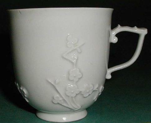 Meissenin posliinia oleva valkoinen tee- tai kahvikuppi. Kuppi on loivasti ulospäin profiloitu. Seinämässä on kolme reliefikenttää, joissa itämaisvaikutteinen kirsikankukka-aihe. Korva voluuttimainen ja simpukka- ja kohoaaltokoristeltu. Kuppi on pohjarenkaan alapintaa lukuun ottamatta lasitettu. Kuppi on ns. Böttger-posliinia.