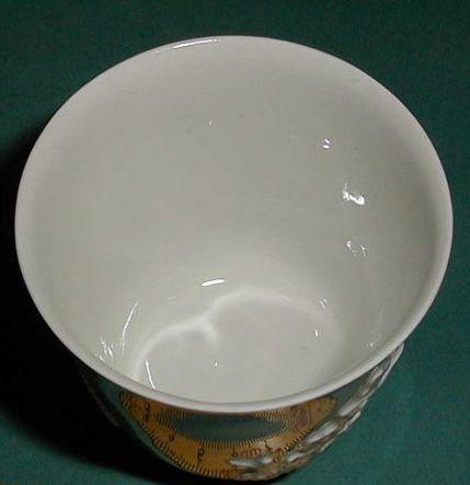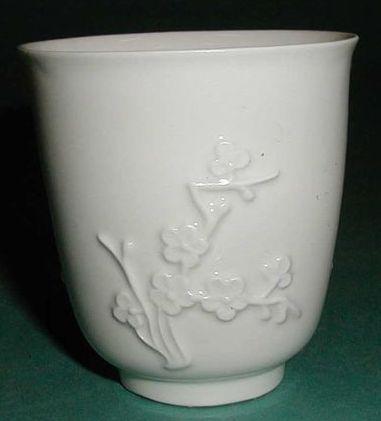 Meissenin posliinia oleva valkoinen, lasitettu tee- tai kahvikuppi. Suorareunainen, korvaton kuppi, jonka ulkoreunaa kiertää kolmessa kentässä oleva reliefimäinen kirsikankukka-aiheinen koriste. Pohjarenkaan alapintaa lukuunottamatta lasitettu, kirkas lasite. Kuppi on ns. Böttger-posliinia.