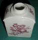 Meissenin posliinia oleva valkoinen teerasia. Suorakaiteenmuotoinen suorasivuinenrasia, jonka yläsivussa on pyöreä auko, jossa on ollut korkki. Hartiaosa on kaareva ja hartiaosan reunus ulkoneva. Pohjaa lukuun ottamatta lasitettu. Pohjaa lukuun ottamatta kaikilla sivuilla lasitteen päälle maalattu viininpunainen kukka-aiheinen koristelu, Deutsche Blumen. Mahdollisia jäänteitä kultauksesta. Rasian hartaosassa leveällä sivulla on polttovirhe.
