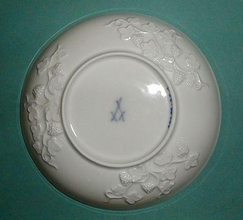 Meissenin posliinia oleva valkoinen, lasitettu tee- tai kahvikupin aluslautanen. Sisäpuoli on tasainen, reuna nousee jyrkästi ylöspäin, kulma pyöreä. Ulkolaidalla on kolme reliefikenttää, joissa on viiniköynnöksen lehvistä ja tertuista muodostuva viininlehväaihe. Jalkarengas. Jalkarenkaan alapintaa lukuun ottamatta lasitettu. Lautanen on ns. Böttger-posliinia.
