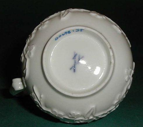 Meissenin posliinia oleva valkoinen kannu. Pyöreäpohjainen, lyhytnokkainen maitokannu, jossa on profiloitu otin. Koristereliefeinä voluutti, kohoaalto, simpukka ja laakerinlehti. Kannussa on jalkarengas ja selvä kaulaosa, muta ei suunrengasta. Kannun molemmilla puolilla reliefimäinen kirsikankukka-aiheinen koristelu. Myös kaatonokassa voluuttireliefi. Astia on pohjarenkaan alapintaa lukuun ottamatta lasitettu, kirkas lasite. Kannu on Böttger-posliinia.