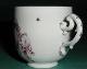 Meissenin posliinia oleva valkoinen, lasitettu kuppi. Suorareunainen kuppi, jossa on profiloitu korva. Suuosa on loivasti ulospäin profiloitu. Kupissa on profiloitu, kaksoisvolyyttimainen korva. Kuppi on lasitettu pohjarenkaan alapintaa lukuun ottamatta. Kirkkaan lasitteen päälle maalattu viininpunaisia kukka-aiheisia koristeita, Deutsche Blumen. Posliinimassan väri valkoinen.
