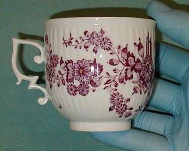 Meissenin posliinia oleva valkoinen, lasitettu kuppi. Suorareunainen kuppi, jossa pystysuora uritus, Gebrochener Stab-reliefi. Suuosa on loivasti ulospäin profiloitu. Kupissa on profiloitu, kaksoisvolyyttimainen korva. Kuppi on lasitettu pohjarenkaan alapintaa lukuun ottamatta. Kirkkaan lasitteen päälle maalattu viininpunainen japanilaistyyppinen Kakiemon eli Indianische Blumen -kukkakoriste. Reuna kullattu. Posliinimassan väri valkoinen.