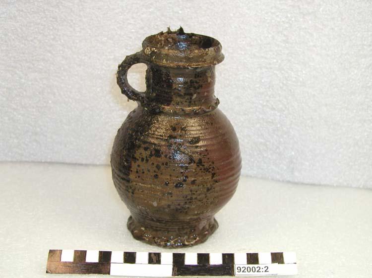 | huomiot | Osan tekniikka: keramiikka; Osan materiaali: keramiikka; Osan mitat: halkaisija, suurin 8.50 cm; halkaisija, suurin 6.75 cm; Kirjallisuus: -D. Gaimster: German Stoneware 1200-1900, archaeology and Cultural History, Cambridge University Press, 1997 -ed. D. Gaimster, M. Redknap: Everyday and exotic pottery from Europe c. 650-1900 : studies in honour of John G. Hurst, Oxford, 1992 -ed. D. Gaimster, M. Redknap, H-H. Wegner: Zur Keramik des Mittelalters und der beginnenden Neuzeit im Rheinland, Oxford, 1988; Claes Wahlöö: Keramik 1000-1600 i svenska fynd, Archaeologica Lundensia, kulturhistoriska museet, Lund, 1976; David Gaimster, Hanseatic Trade and Cultural Exchange in the Baltic cirka 1200-1600. Pottery from Wrecks and Harbours. Teoksessa Schutz des Kulturerbes unter Wasser. Lübstorf 2000.; Osa: pohjareuna; suureuna; Koristelu: Kannun kaulassa kohovyö, joka on koristeltu aaltomaisella rullaleimapainanteella. Pohjareuna on koristeltu sormipainantein.; Kontekstiaika: 1300-luku; 1300-luku, keskiaika; Aineistotyyppi: esine |