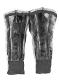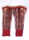 Ruskeat peurannahkaiset säpäkkeet, neulotut kuudesta kaistaleesta, joiden saumassa punaista ja keltaista flanellia: alapään jatkokset kuin myös yläsyrjän reunus ovat punaista villakangasta; yläsyrjässä myös tupsut punaisesta ja keltaisesta flanellista.