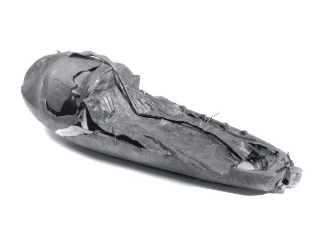Runko yhdestä puusta koverrettu, pohja pyöristetty. Komsio kapenee jalkopäätyä kohti, pääty on suorareunainen ja korkeudeltaan laitojen tasalla. Jalkopäädyn ulkolaidassa on suurikokoista kupin korvaa muistuttava uloke, jonka reikään on sidottu nahkanyöriä. Kuomu on pitkä ja suipohko; sitä kannattelee kaksi paria poikittaisia liisteitä. Komsion ulkopinta on verhoiltu nahalla, kuomun ympäri pingotettu nahka on pahoin ratkeillut ja sitä on osin korjattu. Laitojen nahkaverhoiluun on ommeltu nahkarakseja, joihin on voitu pujottaa esineeseen kuuluvaa nahkanyöriä kaaristeeksi. Kaaristeen alle kuuluvia nahkaliepeitä ei tässä komsiossa ole; sen sijaan kuomun etureunaan on kiinnitetty pitkä, lähes jalkapäätyyn ylettyvä nahkaverho, joka on todennäköisesti ollut kaaristeen alla. Kuomun päältä keskeltä lähtee katkennut 60 cm pitkä nahkahihna, joka on ilmeisesti kiinnittynyt jalkopäätyyn.