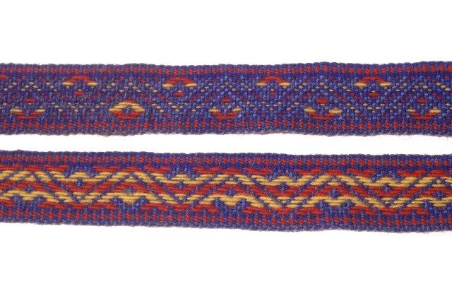 Naisen kengänpaulat, villaa, kudottu nauhapirralla. Värit: sininen, punainen, keltainen, harmaa. Paulan päät kierretty, ei letitetty, keskeneräiset. Solmu lankojen päissä.