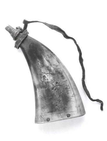 Litteäksi puristetusta lehmänsarvesta tehty ruutisarvi. Toiselta sivultaan koristeltu.