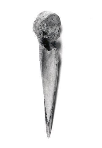 Lampaan sääriluusta tehty naskali. Ponneksi on jätetty nivelen kohta koskematta.