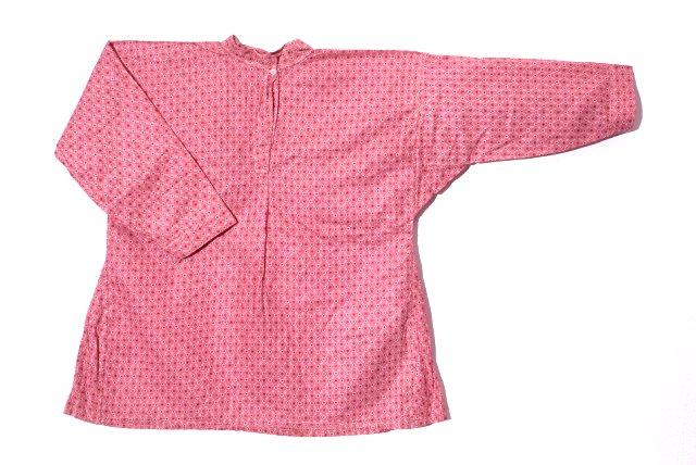 Ommeltu punaisesta kukkakuviollisesta ostopuuvillakankaasta. Etu- ja takakappale leikattu yhtenä kappaleena, olkasaumoja ei ole. Sivusaumoihin lisätty kiilat. Hihat ja hihakiila ommeltu lähes suorakaiteen muotoisesta kappaleesta sekä siihen kiinteästi kuuluvasta neliön muotoisesta palasta. Edessä yhdellä napilla suljettava halkio. Puserossa on matala pystykaulus.