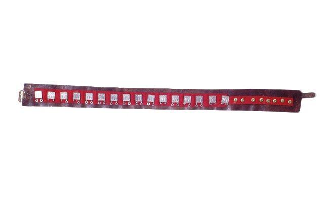 Helavyö. 8,5 cm leveän nahkakaitaleen päälle on kiinnitetty kapeampi, 5 cm:n levyinen ja n. 76 cm:n pituinen punainen verkakaitale, jonka päälle on kiinnitetty yhteensä 16 tinasta tehtyä helaa. Helojen koristeaiheena ovat kolme pyhimystä. Verkakaitale jatkuu vielä 26 cm:n mittaisena ja 3 cm:n levyisenä ja sen päälle on kiinnitetty 8 tähtikuvioista messinkinappia. Vyönsolki 5 cm korkea, messinkiä.