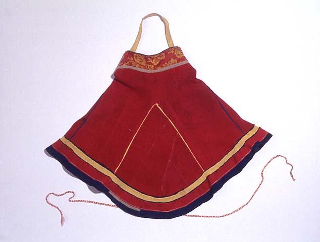 | huomiot | Osan tekniikka: käsityö/tekstiili; Osan materiaali: kangas; Osan mitat: korkeus 46.00 cm; ympärysmitta 106.00 cm; ympärysmitta 62.00 cm; korkeus 63.00 cm; Osa: etuosan keskikohta; helma; pääntie; takaosan keskikohta |