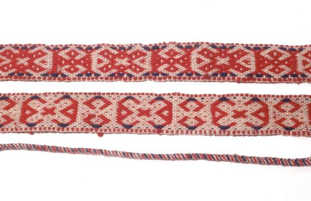 Kengänpaulat, kude ja loimi villaa, päät letitetty, päissä tupsut. Värit: luonnonvalkoinen, punainen ja sininen.