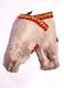 Valkeasta poronturkiksesta tehdyt kintaat. Kintaiden suissa leveät punaiset verkanauhat, joiden päällä on kapeampi keltainen sahalaitainen nauha.