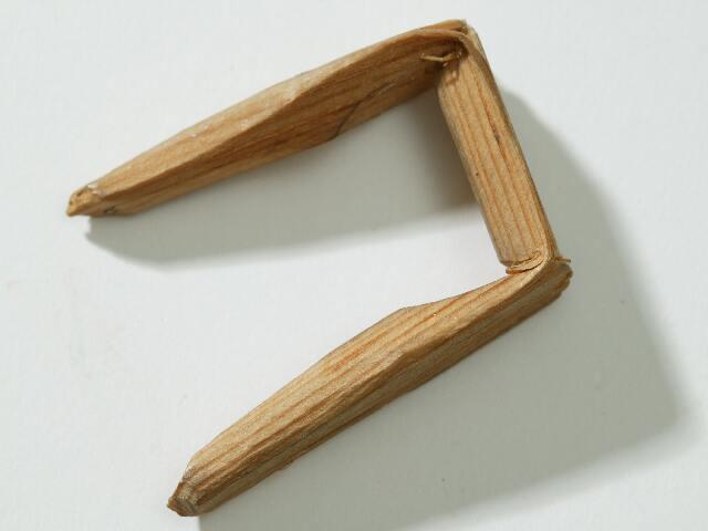 Pinsetit on valmistettu puusta. Puutikussa kaksi lovea, joiden kohdalta tikun päät on taivutettu vastakkain. Pinseteillä on tempaistu irti silmäluomen sisäpuolelle kasvanut karva.