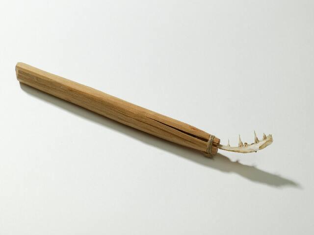 Suonirauta on valmistettu hauenleukaluun palasta. Se on kiinnitetty puiseen varteen siten, että varren päätä on vähän halkaistu, luuosa pantu väliin ja varsi on päästään sidottu langalla tiukasti. Luuosa on kaareva ja siinä on tallella kolme piikkiä. Aiemmin ollut ainakin viisi.