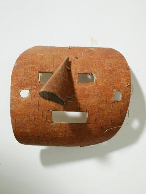 Tuohilevystä tehty naamio, johon on leikattu aukot silmien ja suun kohdalle. Nenä on tehty tuohenpalasta kahtia taivuttamalla ja ompelemalla se kiinni. Molemmilla sivuilla on reikä kiinnitysnauhaa varten.