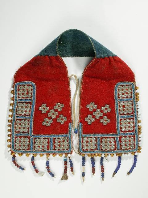 Kaulus on ommeltu punaisista ja sinisistä verkakangaspaloista. Punaisiin etukappaleisiin on ommeltu sini-valkoista helmikirjontaa, johon on kiinnitetty tinasta valamalla tehtyjä heloja. Kaulukseen on lisäksi ommeltu vinoristin muotoon tinaheloja. Reunassa on isokokoisia keltaisia ja valkoisia lasihelmiä sekä helminauhoja, joissa helmien värit ovat sininen, ruskeanpunainen ja valkoinen.