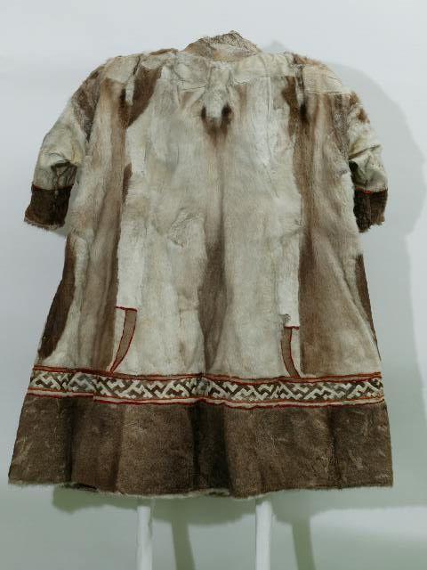 Naisen kesäturkki on ommeltu vaaleista ja ruskeista poronvuodanpaloista siten, että karvapuoli on ulkopuolella. Turkki sidotaan edestä nahkanauhapareilla. Turkki on koristetty liepeistä ja helmasta mosaiikkitekniikalla tehdyin geometrisin kuvioin. Eriväristen nahkapalojen väliin on lisätty punainen verkatere. Kuviot liepeissä: pääkoppa ja liepeiden nurjalla puolella sekä helmassa: koivunoksa.