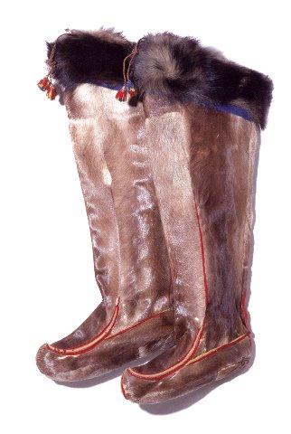Sivakkakarvaisesta poronnahasta tehdyt. Varret ulottuvat polviin saakka. Kauto- ja varrenjuuriompeleet koristetut punasella ja keltasella vaatekaistaleella; ylempiä ompeleita on punasella koristettu. Varren suussa on musta koirannahkainen puuhka, n. 9 cm korkea ja sen rajaompeleessa kiertää ympäri varren sininen verkakaistale. Varren suussa on kurenauha, joka päättyy sini- puna- keltaisiin tupsuihin. Kannan takana on punasesta verasta ommeltu kantaremmi. - Pääluettelo