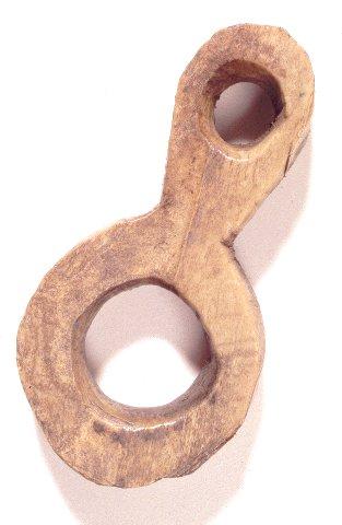 Lähes kahdeksikon muotoinen, koristelematon, karkeasti muotoiltu. Kaksi pyöreää reikää, halkaisijat 2 ja 1,2 cm.