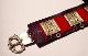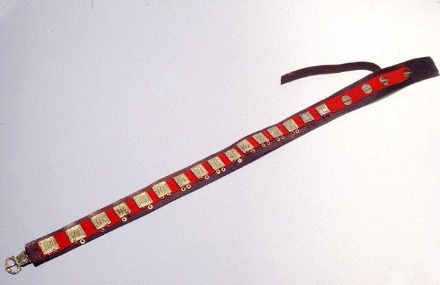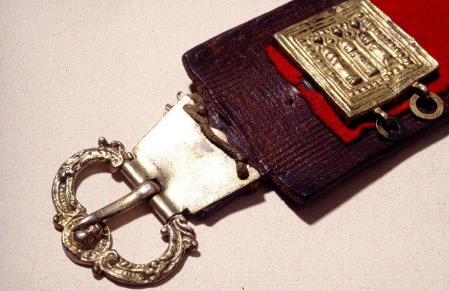 Tummalle nahkalle kiinnitetyn punaverkaisen kaistaleen päällä 14 kullan- ja kaksi hopeanväristä neliömäistä sekä neljä pyöreää hopeanväristä helaa. Neliömäisissä heloissa kuvattu renessanssiajalta periytyvä kolmea pyhimystä esittävä aihe, pyöreissä nuorapunosta.