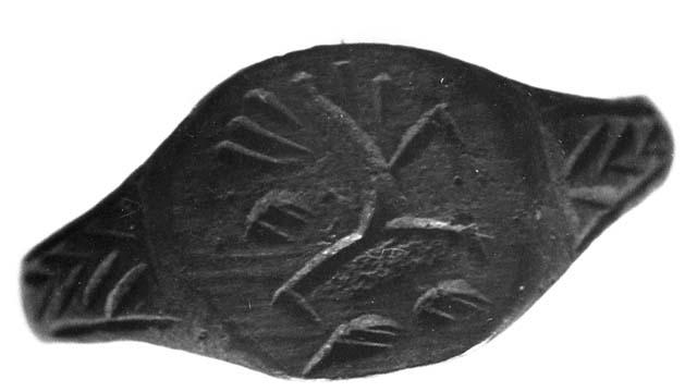 Pronssinen, soikekantainen sormus. Kantaan on kaiverrettu oikealle asteleva suorakaulainen lintu, jonka pyrstö on kuvattu viidellä lyhyellä säteiitäisellä viivalla. Linnun edessä on kaksi ja sen selän päällä yksi pieni kolmikärkinen kuvio. Kanna molemmin puolin kulmaviivoja.