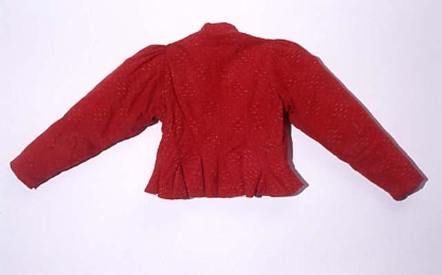 Venäläismallinen vartalonmyötäinen, vyötäröpituinen jakku. Edessä vyötäröllä ja miehustassa muotolaskokset. Takaosa ommeltu kuudesta kappaleesta, jotka alaosastaan levenevät aiheuttaen aaltoilevan helman. Pitkät hihat ovat ylhäältä väljät ja olkapäiltä hieman poimutetut. Röijyssä on matala pystykaulus ja nappikiinnitys. Kangas on punapohjaista, painokuviollista ostopuuvillaa, vuori valkoista puuvillaa. Röijy on selvästi käytössä kulunut, vaikka siihen onkin museon henkilökunta kirjaillut huomautuksen 'malli'. Malli saattaakin tarkoittaa röijyn vuorta, joka näyttääkin käyttämättömältä.