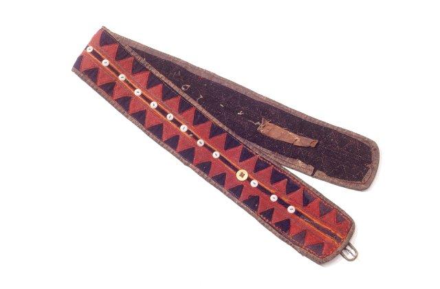 Pohja mustaa ja tummansinistä verkaa. Pintakuvioitu kahdella vastakkain asetetulla punaisella, sahanterälaitaisella verkakankaalla. 19 pientä, valkoista posliininappia ja yksi isompi nappi sahanlaitakaitaleiden välissä rivissä. Osa napeista on kadonnut. Reunat on kauttaaltaan päärmätty nahalla. Osa ompeleen tikeistä on koristeltu villalankapujotuksin. Nurja puoli on mustaa sarkaa.