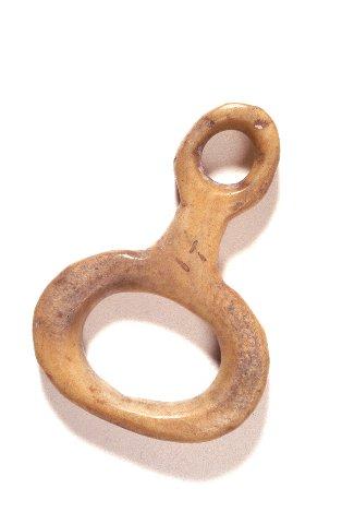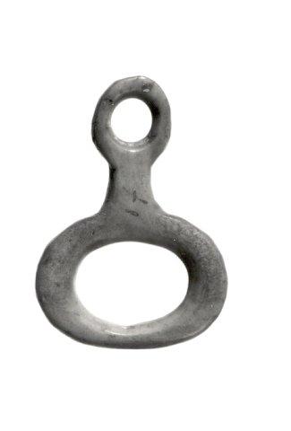 Sirosti muotoiltu, ohut. Toiselle puolelle on ilmeisesti aiottu koristelua. Isompi reikä on soikea, suurin halkaisija 2,2 cm. Pienemmän reiän halkaisija 0,6 cm.