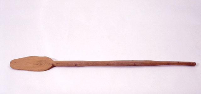 Yhdestä puusta veistetty, käsittelemätöntä mäntyä. Yläpää (kädensija) on hieman muuta vartta ohuempi, alapäässä on suoralapainen levennys.