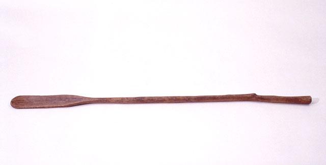 Yhdestä puusta veistetty suksisauva, käsittelemätöntä puuta. Yläpään kädensija lievästi eri kulmassa kuin varsi. Lapa on muodoltaan tasaleveä, lavan toinen puoli hieman kovera.