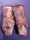 Koipikinttaat, karva ulospäin, suussa 2-kertainen nahka, siinä on myös koristeena punainen kanttausnauha, jonka reunassa on sininen villalanka.
