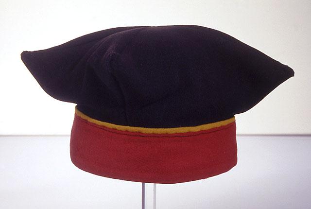 Nelikolkkainen lakki mustaa villakangasta. Vierki ommeltu punaisesta verasta ja sen yläreunassa on kapea keltainen raita. Vuorattu puuvillakankaalla.