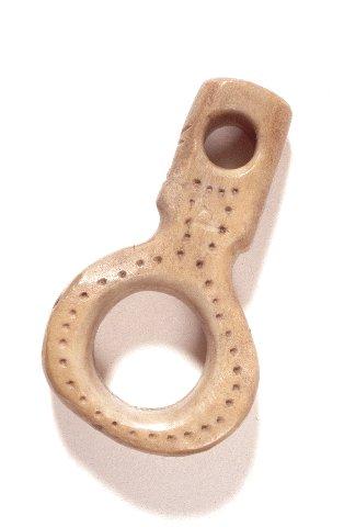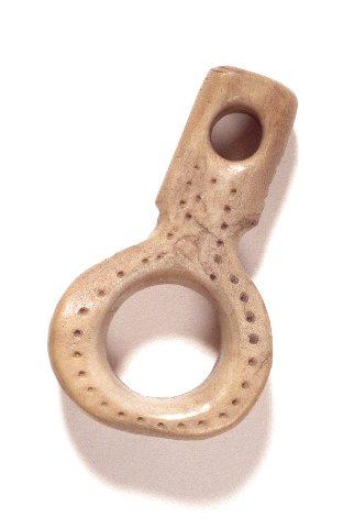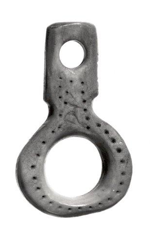Tasapaksu varsi, jonka päässä suuri silmukka (halk. 1,8 cm). Varressa pienempi reikä, halk. 0,6 cm. Varressa pieni kapeampi kohta silmukan juuressa. Molemmin puolin säännöllisellä pistejonolla koristeltu