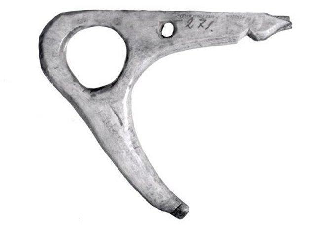 Hihnakoukku, haarukan muotoinen, tyvessä iso reikä, toisessa sakarassa pykälä ja reikä.