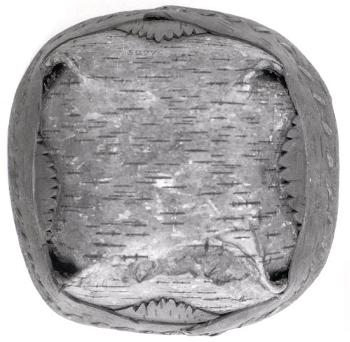 Rove, nelikulmainen, tuohesta poimutettu. Reuna vahvistettu ompelemalla siihen juurilla erikoinen kaista. Sen alla kullakin sivulla kolmiomainen esiinpistävä tuohiliuska, jonka reunat ovat hammastetut.