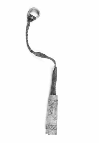 Neulikko, neulojen sija harmaata sarkaa, kannikkeen yläpäässä kaksinkertainen nahkanyöri, joka päättyy luurenkaaseen (läpim. 3,1 cm).