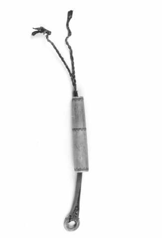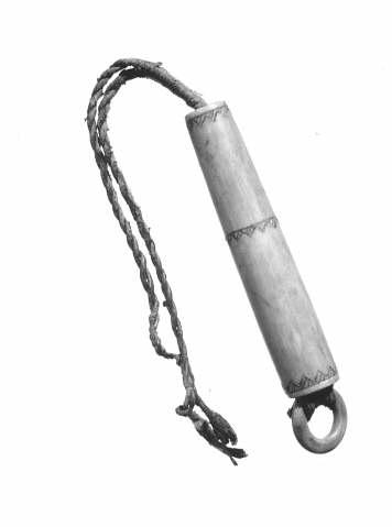 Luusta tehty neulakotelo. Putken päässä ja keskellä sahanteräkoristevyöhyke. Nahkaosa uusi, sen alapäässä luurengas, yläpää leikattu neljäksi liuskaksi, jotka punottu kahdeksi nyöriksi.
