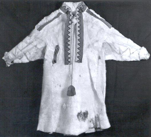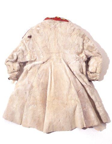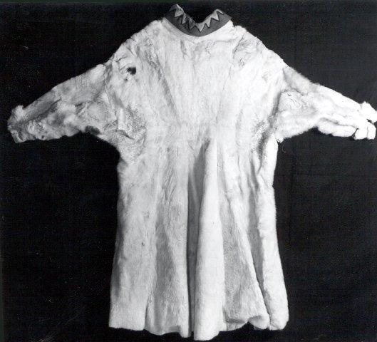 Miehen peski, valkeaa ja hermaata poronvasannahkaa, hihoista karva on kulunut pois. Olkasaumoihin on ommeltu punaista koristeverkaa. Kauluksessa myös punaverkaa, jossa keltaisesta ja vihreästä verasta leikattu sahanteräkoriste. Kauluksesta riippuu eteen päästään verkakoristeinen nyöri. Oikealla kupeella pellavasta tehty sisätasku, jonka suu on päärmätty punaisella verkaliuskalla. Takana kolme helmaan asti ulottuvaa poimua. Peski on ommeltu jännerihmalla.