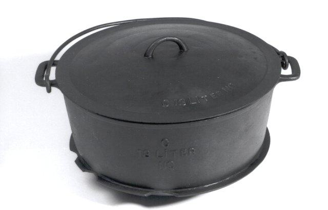 Isokokoinen rautapata, teollisuustekoinen, kolmijalkainen. Korvat vaakasuorat, pohjassa rengasmainen levennys hellaa varten.