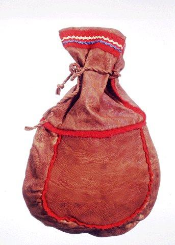 Nahkainen, suusta suljettava kahvipussi. Pussi koostuu yläosasta, etu- ja takakappaleesta sekä yhdestä sivukappaleesta. Saumoissa on punaiset verkatereet. Yläosan saumaan kiinnitetty nahkasta punotut kurenyörit.